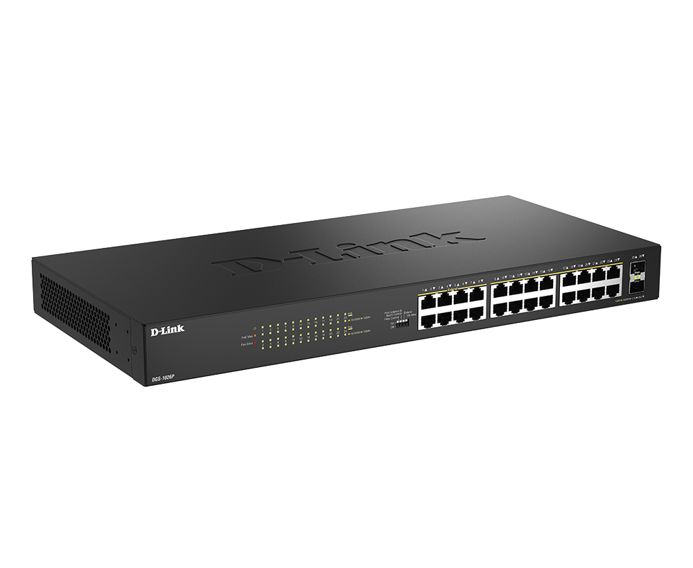 The plug-and-play DGS-1026P with Gigabit PoE+ (IEEE 802.3at) ports delivers up to 30 W per port with a 240 W total power budget, connecting PoE-enabled devices without additional power supplies. Ideal for access points, cameras, displays, and much more. The DGS-1026P simplifies installation, reduces cabling costs, and features a 5-speed smart fan to enhance energy efficiency.