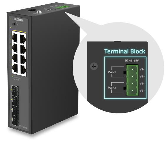 - Dual power inputs provide power redundancy