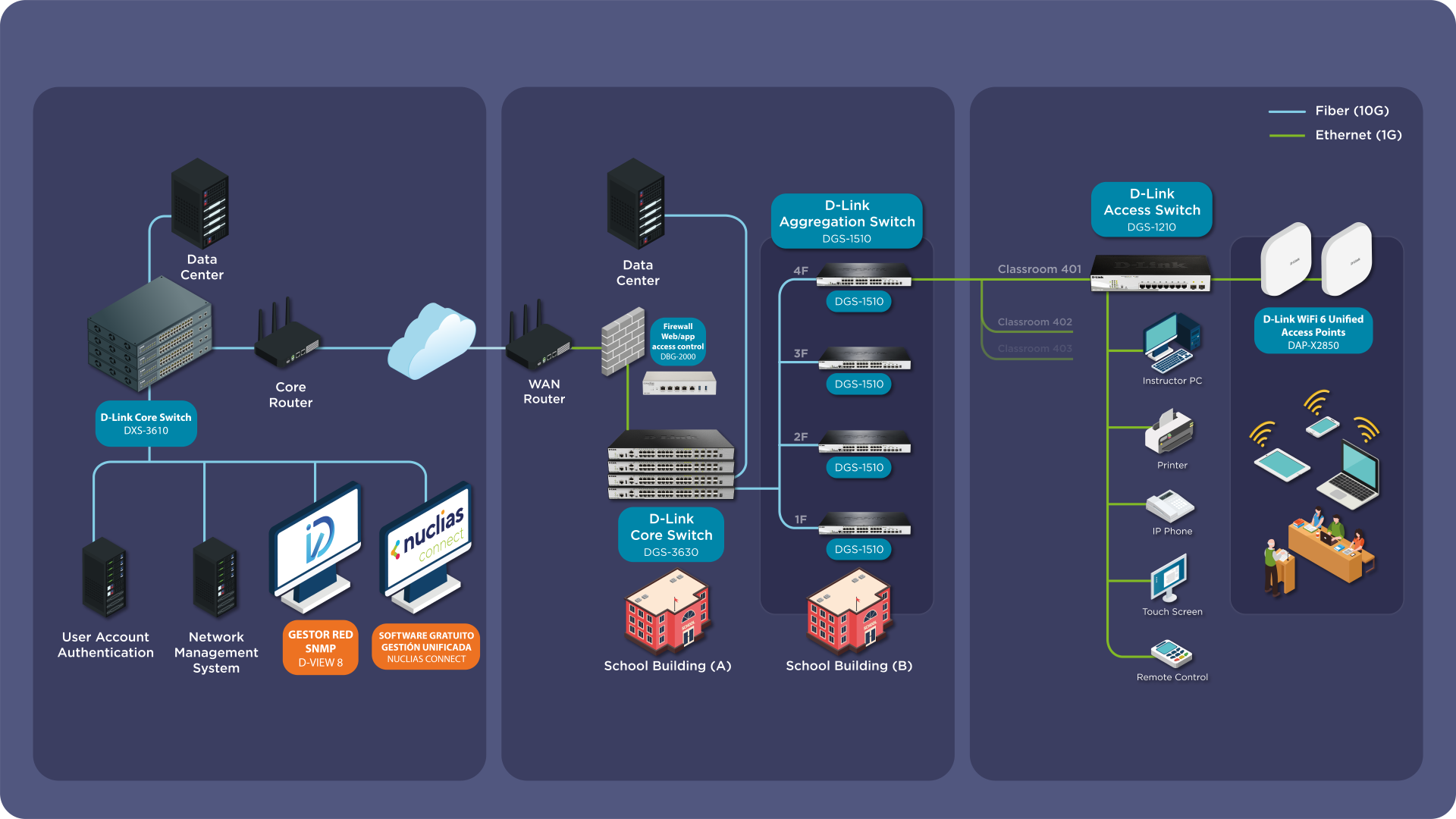En escuelas, colegios o universidades se añaden requerimientos en cuanto al control de acceso a Internet, por lo que es necesario integrar un Firewall como nuestro Gateway SD-WAN DBG-2000 o bien el router profesional DSR-250V2 con filtrado dinámico de webs y apps. Igualmente es necesario administrar la red para crear VLANs de cara a aislar por completo la red de aulas de la red de administración o profesorado, lo que puede hacerse fácilmente desde la interfaz web de la plataforma de gestión unificada, Nuclias Connect.