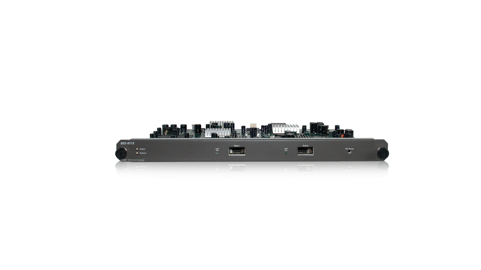 The DES-6512 is a 2-port 10Gbps XFP module for the DES-6500 chassis. It uses 10 Gigabit XFP transceivers for uplinking to servers, storage, or department level switches.