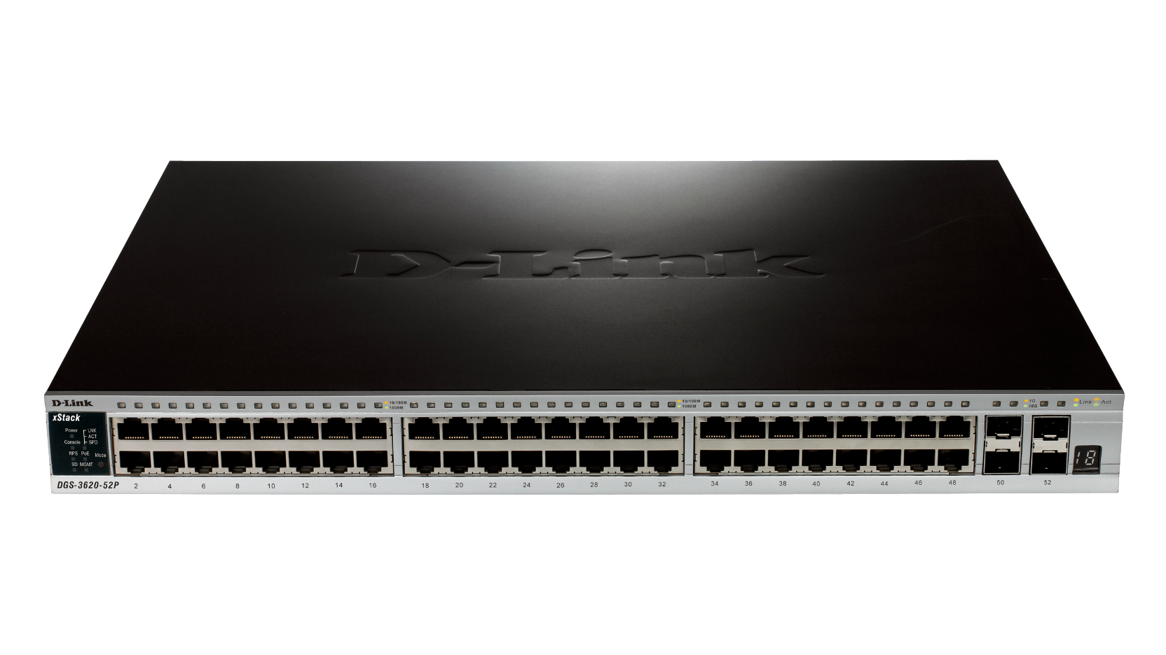 - DGS-3620-52P/SI: 52-Port Gigabit L3 Stackable Managed PoE Switch including 4 x SFP+ 10 Gbps ports (Standard Image)
