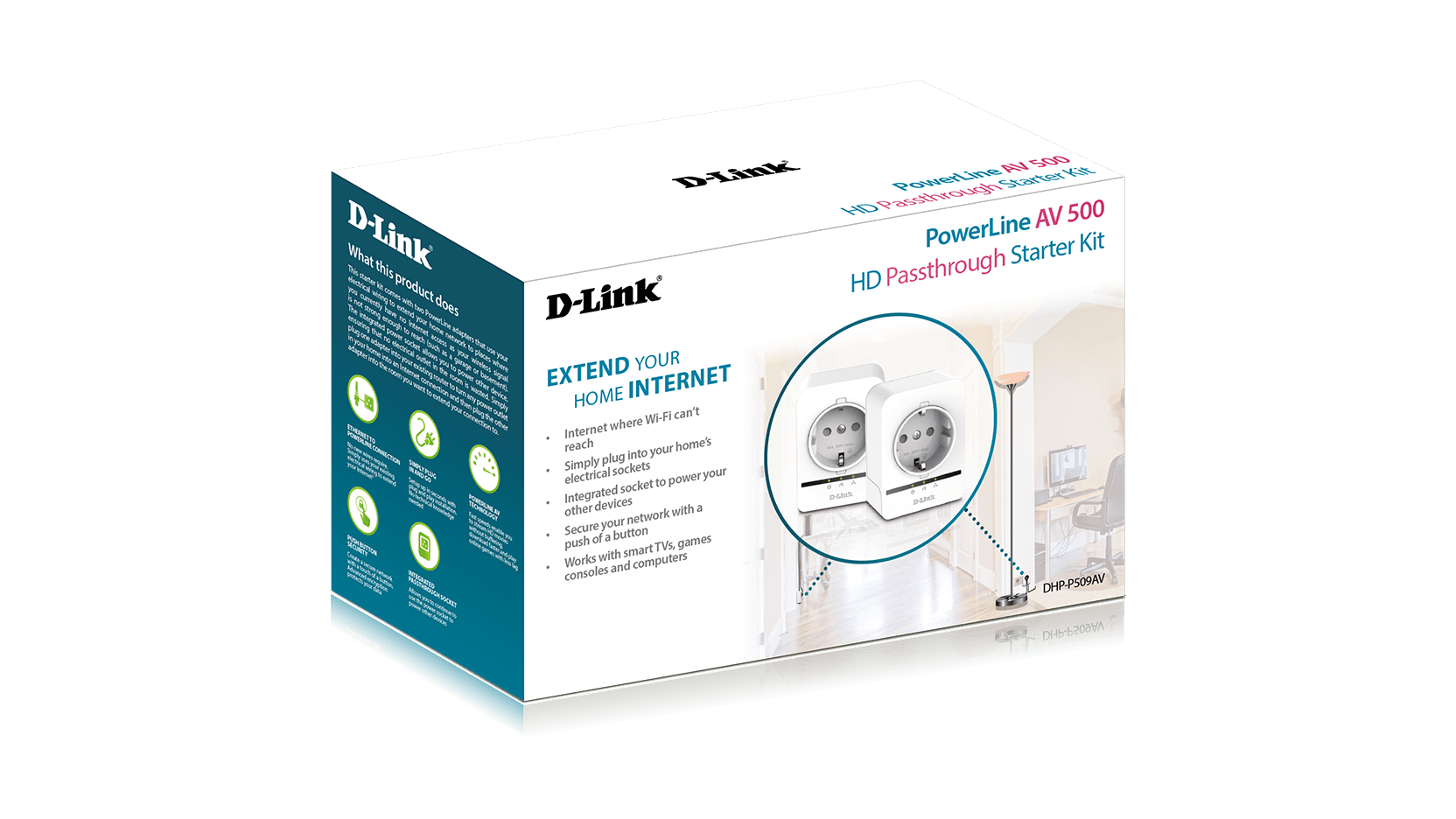 D-Link’s DHP-P509AV PowerLine AV 500 HD Passthrough Starter kit makes it easy to create a high-speed network using your home's existing electrical wiring. Extend your home network to places where you currently have no Internet access, such as a garage or basement. The kit includes two DHP-508AV PowerLine 500 HD Passthrough Adapters – Simply plug one adapter into your existing router to turn any power outlet in your home into an Internet connection and then plug the other adapter into the room you want to extend your connection to.