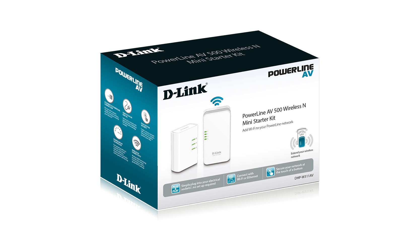 The DHP-W311AV PowerLine AV 500 Wireless N Mini Starter Kit allows you to extend your existing home network to enjoy high-speed and reliable connectivity throughout your home1. The PowerLine AV 500 Wireless N Mini Extender features both wireless and PowerLine. This allows you to benefit from PowerLine networking, compliant with the HomePlug AV standard that uses your existing home electrical wiring to extend your home network. The wireless ability allows you to increase the area in your home where you can use your wireless devices.
