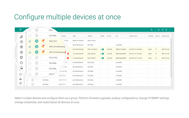 Select either individual or group settings, upgrade firmware, back up or restore configurations, solve IP conflicts, change user credentials, configure the time and date, enable or disable SNMP for network management, reboot or reset devices, and more.