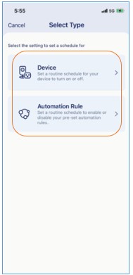 Étape 6 : Sélectionnez une règle d’automatisation si vous avez choisi Règle d’automatisation à la dernière étape. Ou bien, sélectionnez un périphérique pour établir un calendrier de mise en marche ou d’arrêt de votre périphérique si vous avez choisi Périphérique à la dernière étape. Appuyez ensuite sur Suivant.