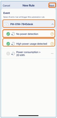 Étape 10 : Sélectionnez votre prise intelligente, et choisissez Pas de tension détectée et/ou Consommation élevée d’énergie détectée comme déclencheurs, puis appuyez sur Suivant.