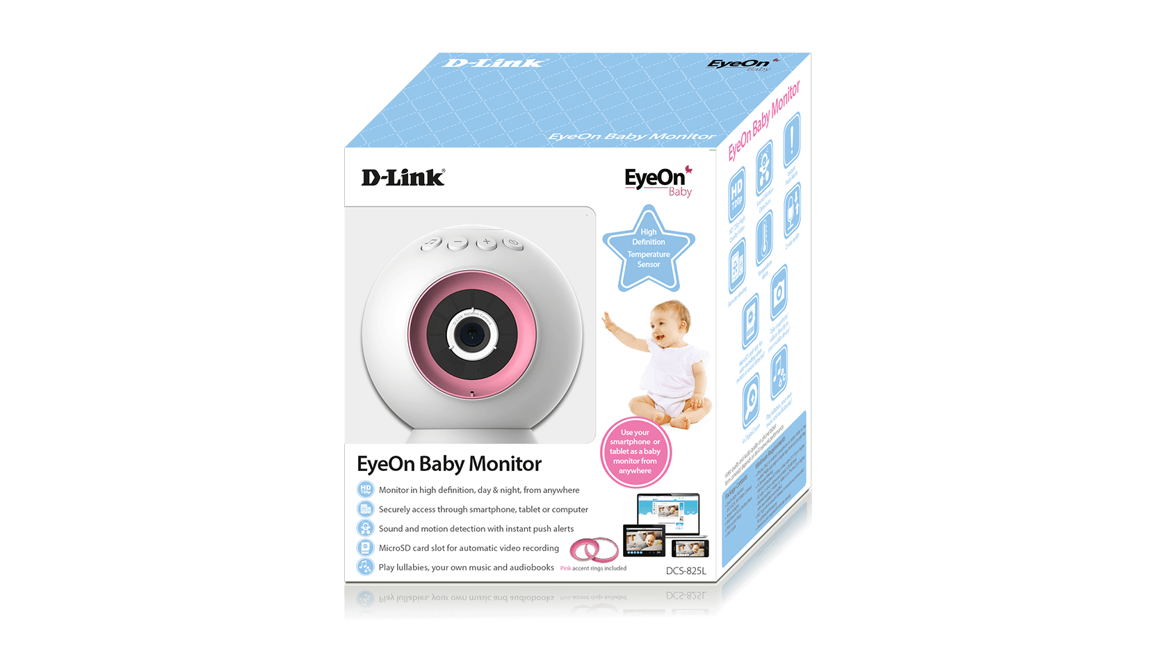 Connecting a camera to your network and accessing it has traditionally required complex configuration. mydlink™ makes it easy to access your EyeOn™ Baby Monitor from wherever you are, whenever it’s convenient for you. Just download the free mydlink™ Baby App for your smartphone or tablet and you can quickly and easily view and configure your EyeOn™ Baby Monitor from anywhere with a wireless or 4G LTE/3G connection. You can also log onto the secure mydlink™ web portal on your computer to see what matters most.