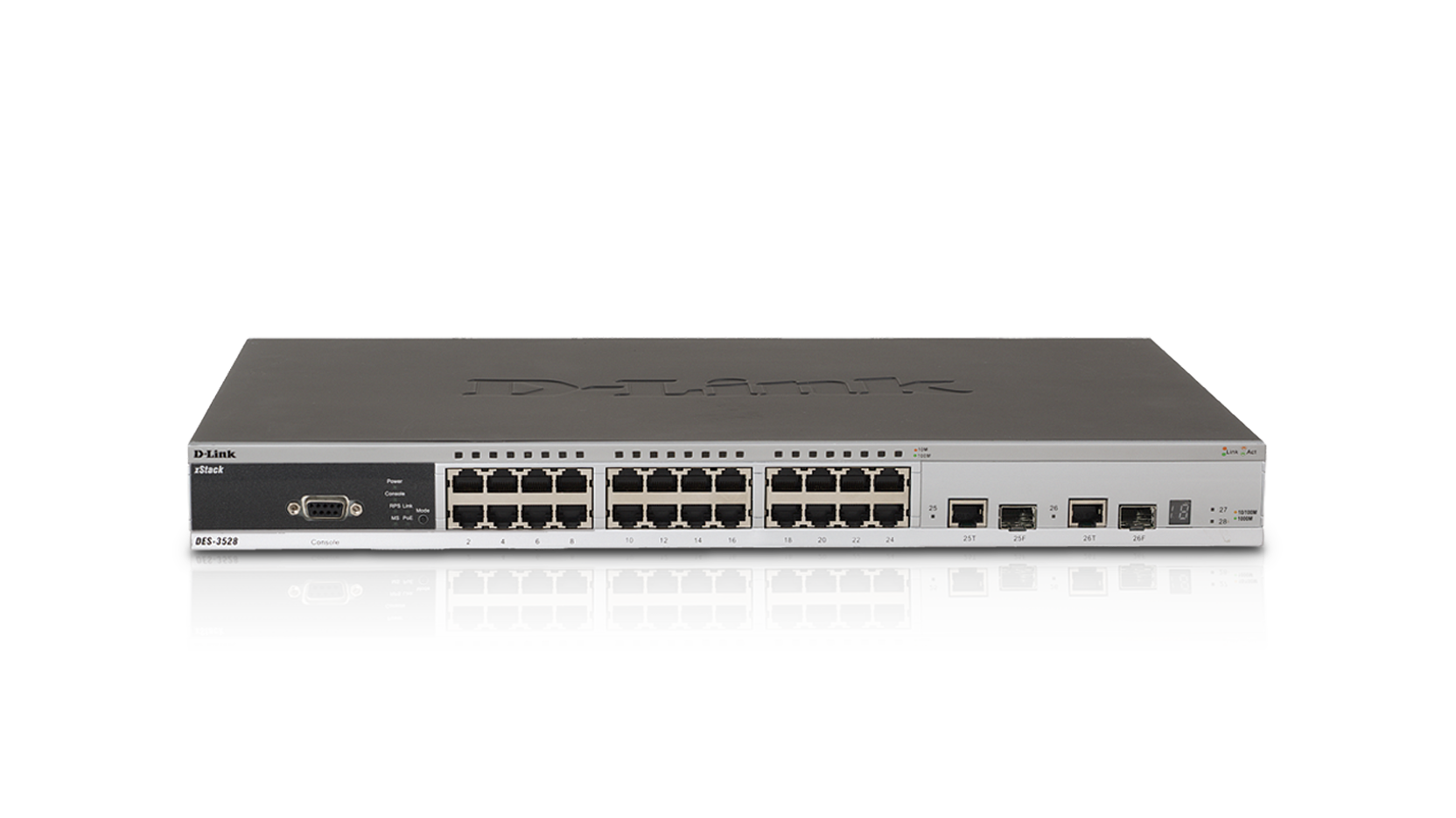 The DES-3528 provides a non-blocking switching solution for 10/100 Fast Ethernet connections. The DES-3528 supports 24 10/100Mbps ports, with 4 gigabit 10/100/1000BASE-T ports. Two of these gigabit copper ports are disabled when the two 1000BASE-X SFP are used, also known as dual personality or combo ports. The DES-3528 has a non-blocking bandwidth of 12.8Gbps; the xStack switch has a redundant power option for mission critical applications.