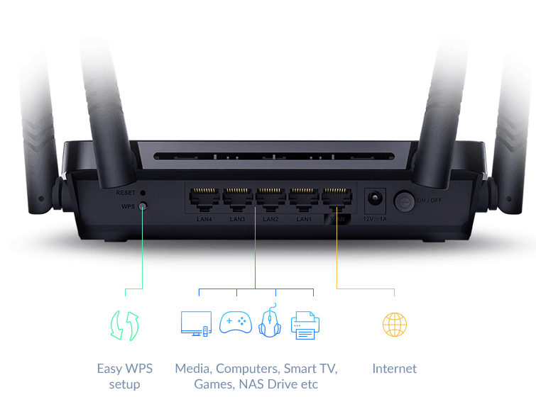 With four Gigabit LAN ports, connect up to 4 wired devices for speeds up to 10x faster than standard Fast Ethernet connections. Now you can connect your critical devices with low-latency and reliable wired connections.