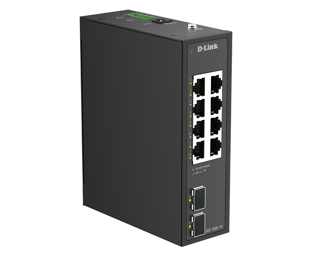 The DIS-100G-10P is an industrial unmanaged switch equipped with eight 1G PoE ports and two SFP ports, providing plug-and-play simplicity for deployment. The SFP ports support long-range data transmission, removing the distance limitations of traditional Ethernet cabling. With reliable, high-performance operation, it's well-suited for edge deployments in applications like HD surveillance, wireless access points, and more.