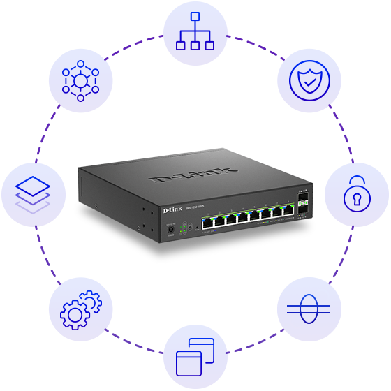 The DMS-1250 Series switches offers a range of management tools to cater to users' diverse needs. D-Link Nuclias Controller (DNC) and D-Link Nuclias Hub (DNH) enable the discovery and management of multiple D-Link devices, providing access to configure settings efficiently. Furthermore, the DMS-1250 Series can be seamlessly managed through D-View 8, a comprehensive central network management system. SNMP functionality allows for centralized network asset management, remote configuration, and logging functions.