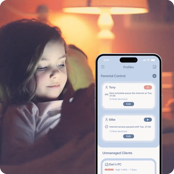 Az AI Wi-Fi Optimizer könnyedén javítja a hálózatot azáltal, hogy minden eszközhöz a legtisztább és leghatékonyabb Wi-Fi-csatornát keresi. Az AI Mesh Optimizer pedig automatikus útvonal-optimalizálást és öngyógyító képességeket biztosít, biztosítva a stabil hálózati kapcsolatot lassulások és gyenge jelek nélkül. Most már élvezheti az erős kapcsolatot minden eszközén, bárhol is legyen otthonában.