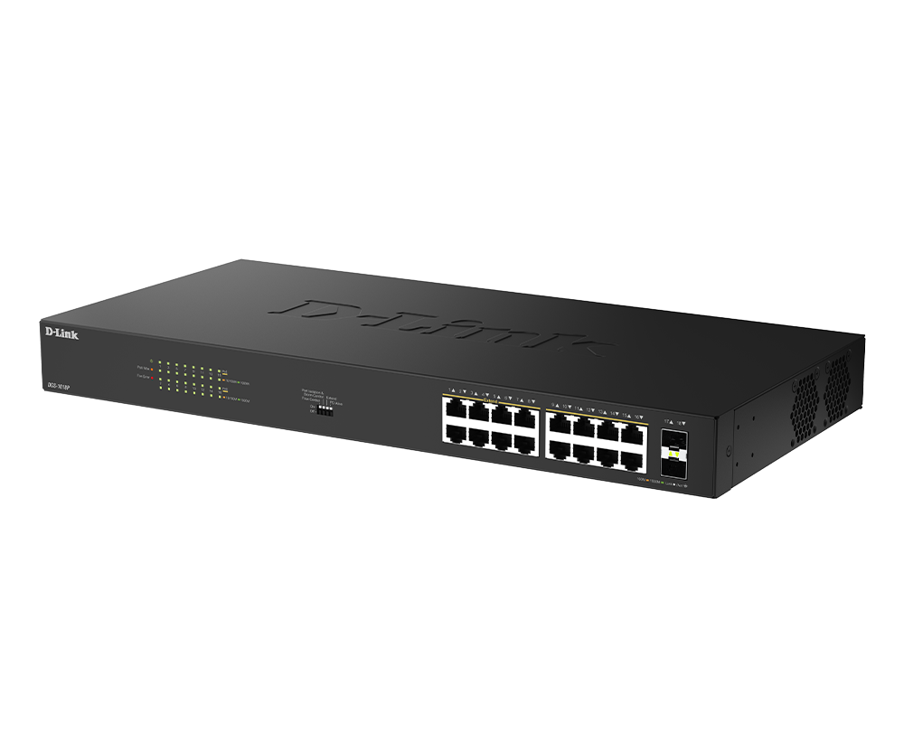 The plug-and-play DGS-1018P with Gigabit PoE+ (IEEE 802.3at) ports delivers up to 30 W per port with a 240 W total power budget, connecting PoE-enabled devices without additional power supplies. Ideal for access points, cameras, displays, and much more. The DGS-1018P simplifies installation, reduces cabling costs, and features a 5-speed smart fan to enhance energy efficiency.