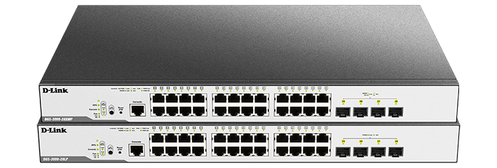The DGS-3000-28LP switch features Power over Ethernet (PoE), and switching capacities of 56 Gbps.