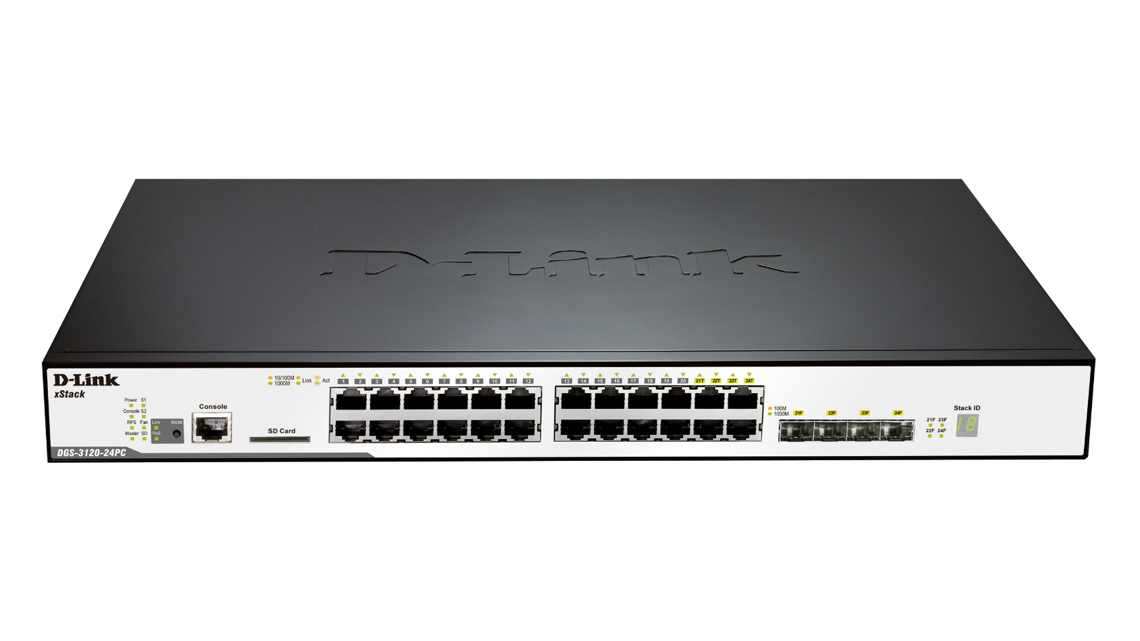 - DGS-3120-24TC: 24-Port Gigabit L2 Stackable Managed Switch including 4 x Combo 1000BASE-T/SFP ports and 2 x 10 Gbps stacking ports (smart fans)