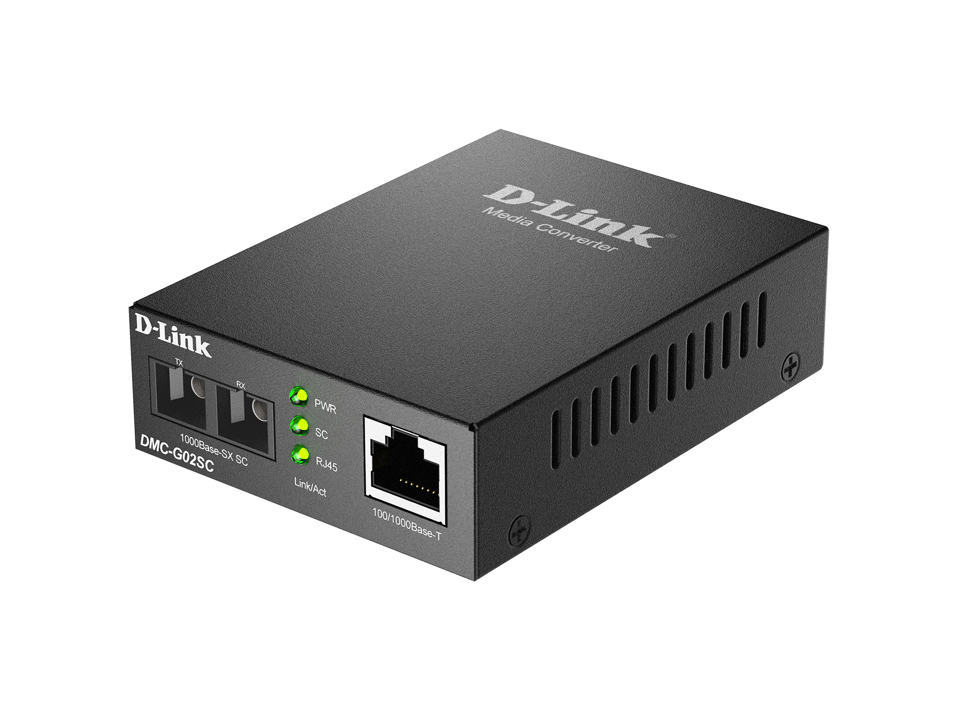 The DMC-G02SC is a media converter designed to convert a twisted-pair 100/1000Base-T Gigabit Ethernet connection to a multi-mode fibre 1000Base-SX Gigabit Ethernet connection to extend a connection distance (up to 550 m) between two devices. This media converter is equipped with one RJ-45 for twisted-pair and one fibre optic SC port.