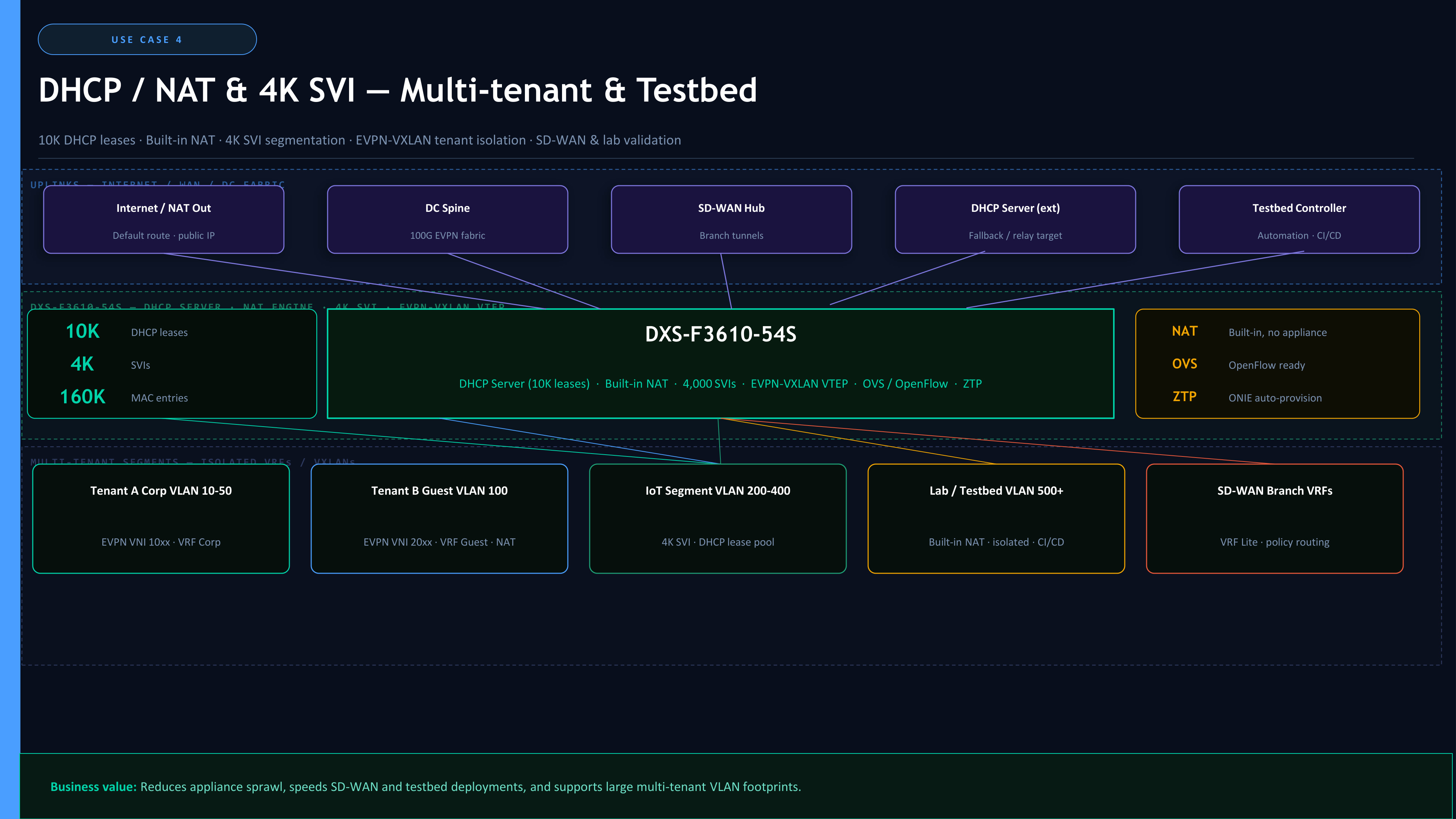 Consolidate DHCP server (10K leases), built-in NAT for labs, and 4K SVI segmentation on one platform. EVPN-VXLAN virtualizes the network from the underlay — enabling isolated tenant or IoT segments at scale.