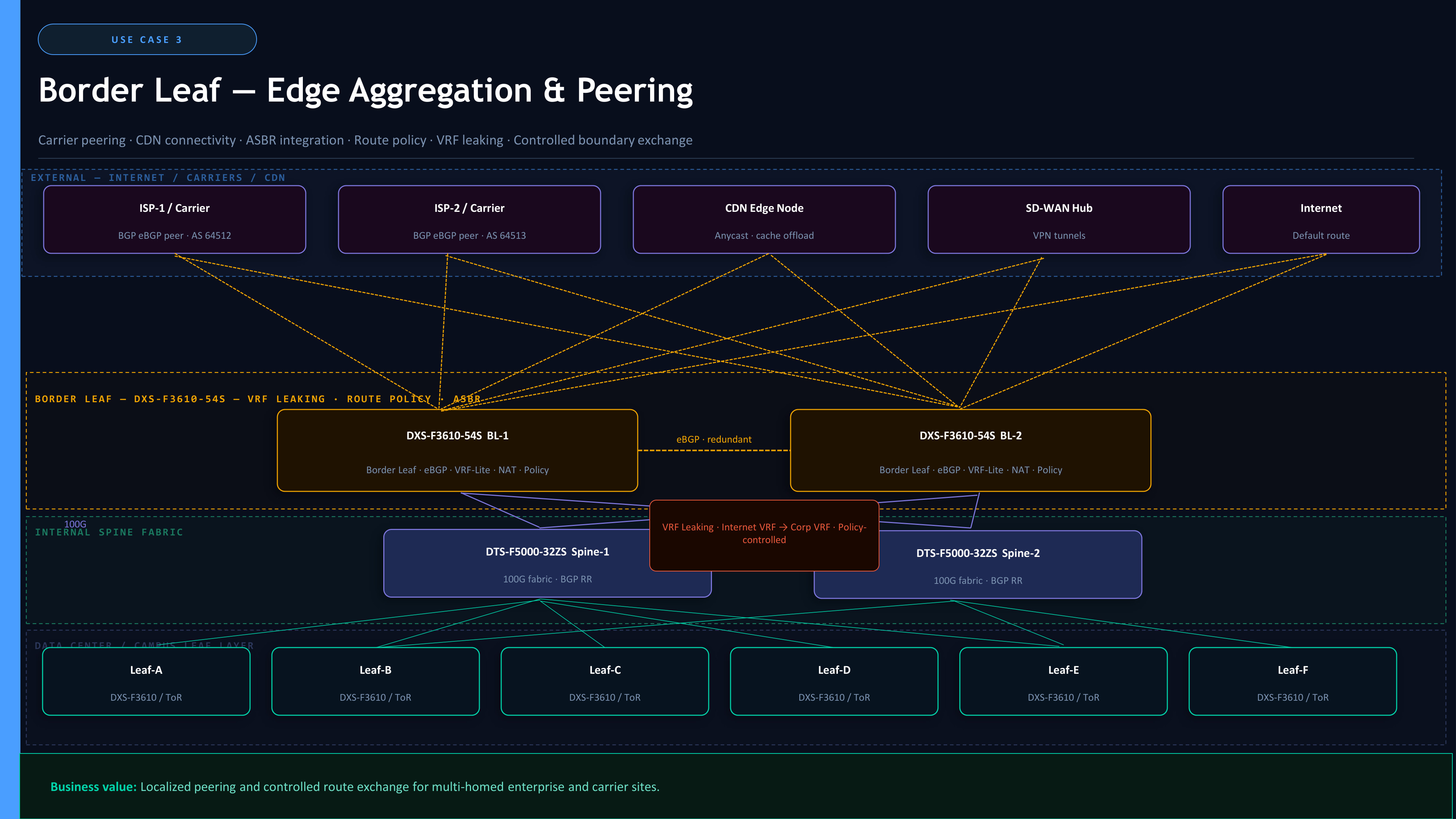 Edge aggregation for carrier peering, CDN connectivity and ASBR integration. Handles route policy, VRF leaking and controlled boundary exchange.