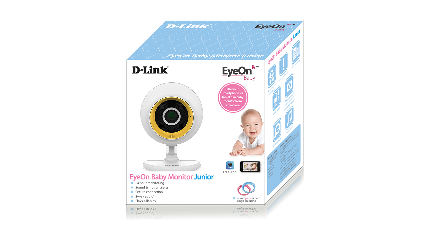 La videocamera EyeOn™ Baby Monitor Junior è stata progettata specificamente per rendere facile il monitoraggio dei bebé. Il monitoraggio attiva automaticamente la visione notturna ad infrarossi quando diventa buio, in modo che tu possa sorvegliare il tuo bimbo giorno e notte. È perfetta per l'utilizzo in casa, ma anche quando sei via; è una videocamera mydlink™, quindi ti permette di controllare in tempo reale il tuo bimbo dal tuo smartphone o tablet dovunque tu sia attraverso una qualsiasi connessione Internet.