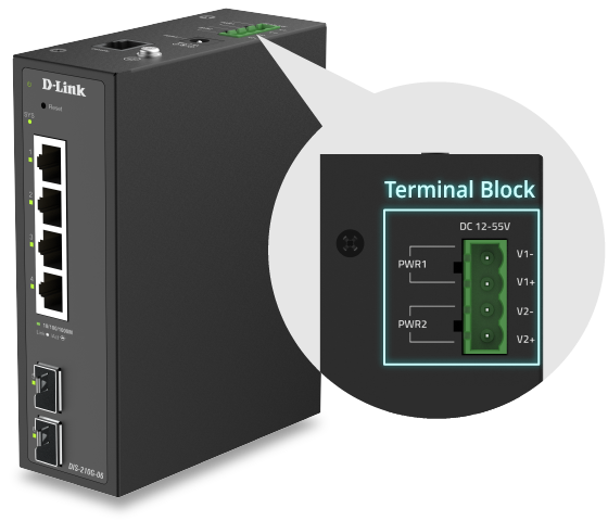 The DIS-210G-06 is an industrial smart switch equipped with four 1G ports and two 1G SFP ports for network management and aggregation. The SFP ports support long-distance data transmission, rapid failover redundancy, and throughput aggregation. The DIS-210G-06 supports ERPS and static routing, which reduces latency, enables effective traffic control, and improves network scalability and efficiency.