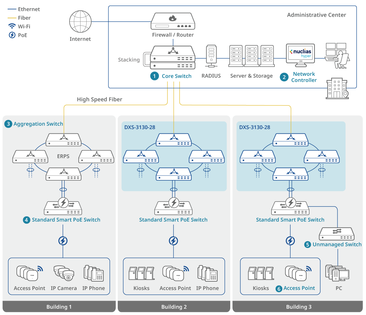 Il DXS-3130-28 garantisce un'operatività continua con alimentazione ridondante e stacking. Il ripristino ERPS di 50 ms riduce al minimo i tempi di fermo, il Loopback Detection blocca le porte colpite da tempeste di traffico e il VRRP fornisce un routing di backup senza interruzioni, rendendolo ideale per ospedali, stabilimenti industriali e altre reti mission-critical.