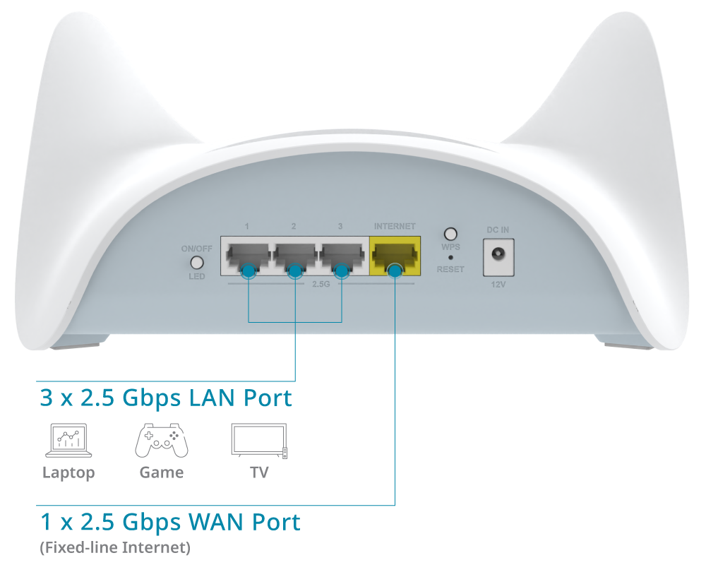 3 x 2.5 Gigabit Ethernet LAN ports 1 x 2.5 Gigabit Ethernet WAN port 1 x WPS button 1 x reset button 1 x power connector 1 x LED on/off |