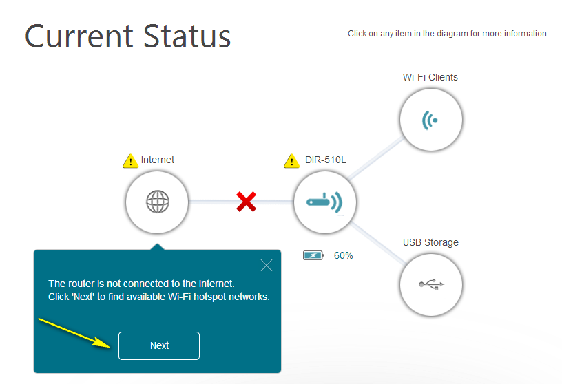 Step 8: If the Internet icon is grey and there is an exclamation mark icon next to it, click on the Internet icon to view the router’s Internet settings.