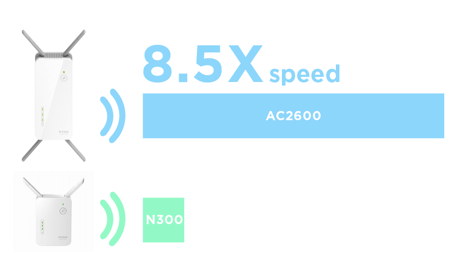 AC2600 Wi-Fi delivers up to 8.5x more speed than N300 extenders.