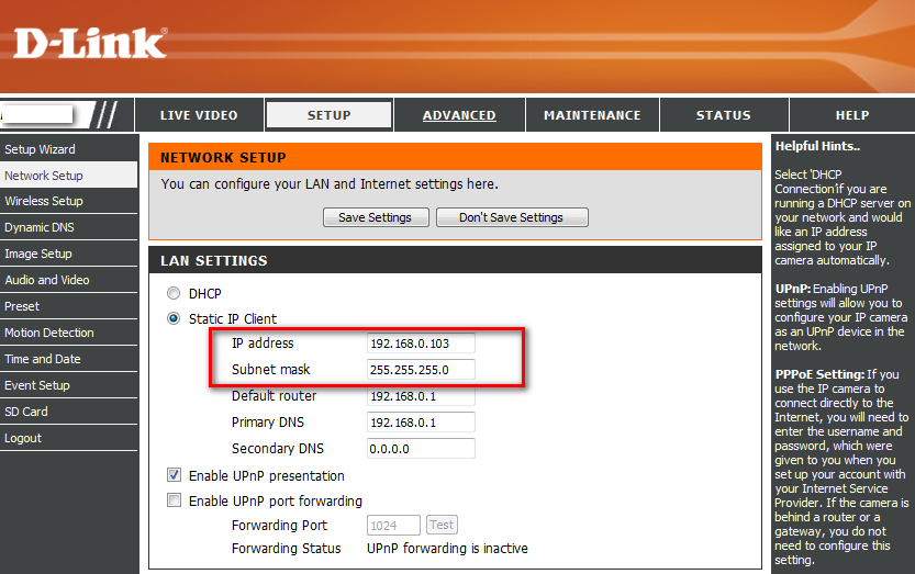Step 4: Select Network Setup from the menu on the left hand side of the page, and select the Static IP Address radio button.