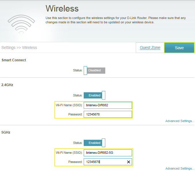 Step 2: In the wireless Wi-Fi name (SSID) field (for both the 2.4 and 5GHz sections), erase the default name (dlink-xxxxx) and enter a unique wireless network name (This is the name you will see when scanning for wireless networks on your computer/wireless device).