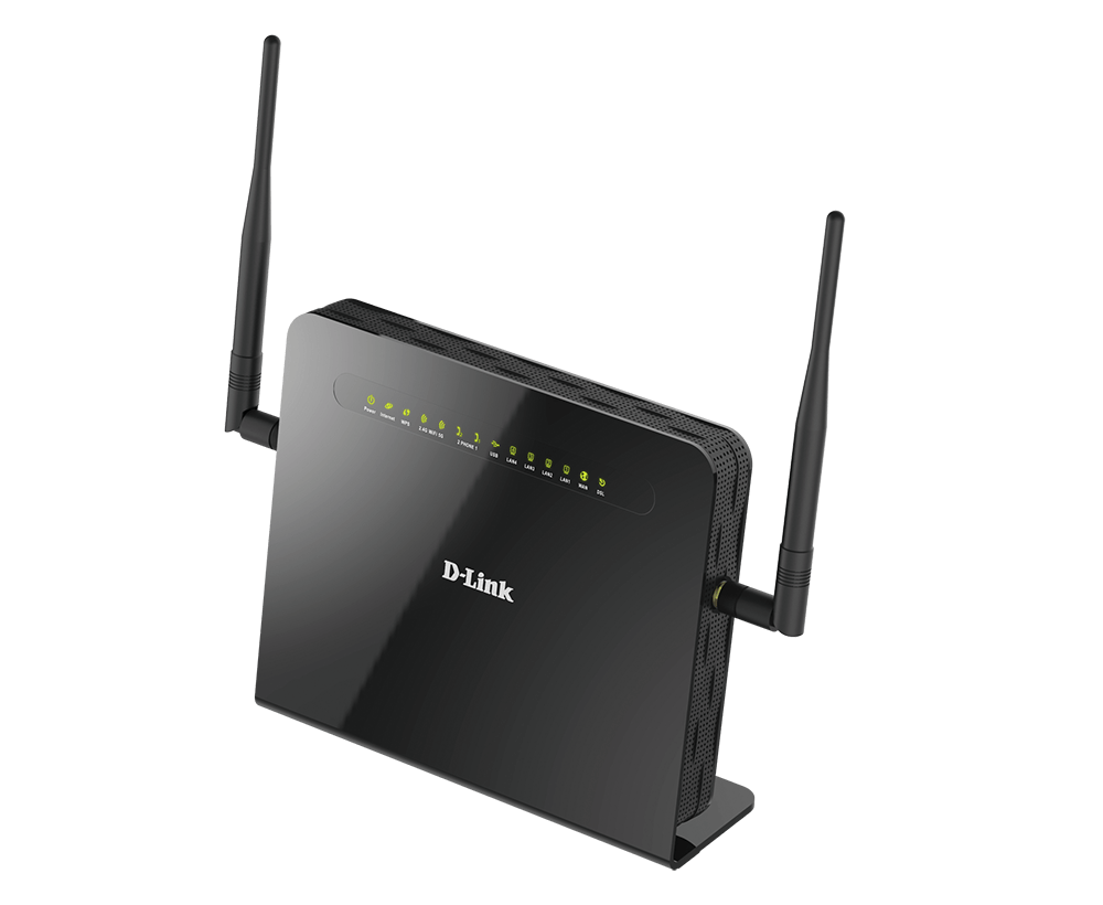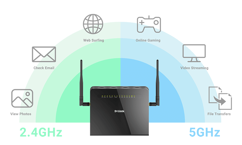 The DSL-G2452DG uses the latest Wireless AC technology, which provides transfer rates of up to 1.2 Gbps (866 AC + 300 N). The router operates on both the 2.4 GHz and 5 GHz wireless bands at the same time using concurrent dual-band technology and two external antennas. This allows you to browse the web, chat, and e-mail using the 2.4 GHz band, while simultaneously streaming digital media, playing online games, or making Internet voice calls on the 5 GHz band.