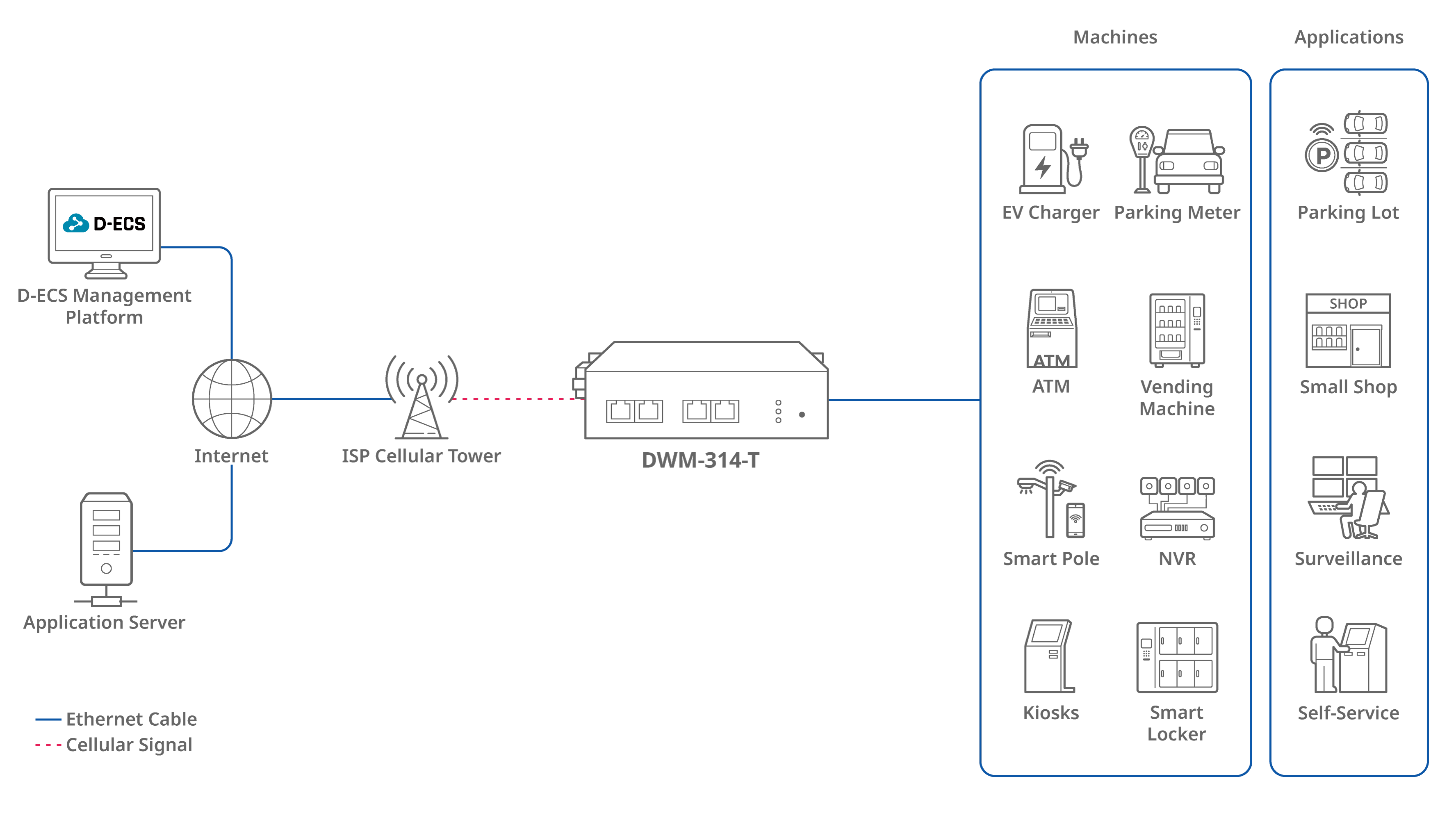 The DWM-314-T 4G Multi-Connect Modem offers instant access with its 4G LTE and Ethernet interfaces, providing a true plug-and-play experience that's ideal for versatile applications. This modem grants wired connectivity to almost any device, from EV chargers and parking meters to ATMs, vending machines, smart poles, NVRs, kiosks, and smart lockers. It is perfect for integrating into diverse environments such as parking lots, retail shops, surveillance systems, and self-service stations. For custom configurations, the user-friendly web interface allows easy adjustments via any web browser.