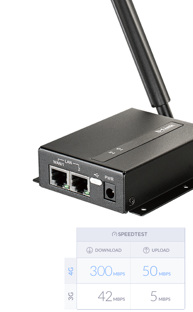 Connectez-vous facilement à votre connexion mobile haut débit 4G/3G LTE et profitez de vitesses de liaison descendante allant jusqu'à 300 Mbit/s1 et de vitesses de liaison montante allant jusqu'à 50 Mbit/s1 - facilitant un accès Internet rapide, fiable et réactif qui vous permet de déployer le routeur dans un emplacement distant tout en continuant d'accéder à vos appareils depuis n'importe quel endroit.