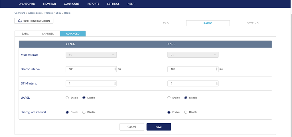 2. Go to Configure/ Access point/ profile/ Radio/ Advanced.