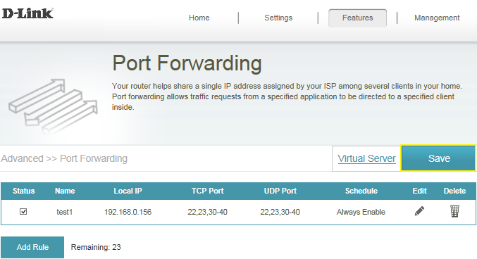 - External/Internal Port: Enter the port number you want to open (i.e. 21, for FTP)