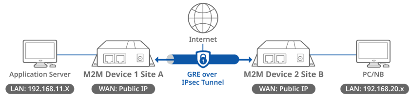 This topology diagram illustrates a GRE over IPsec VPN scenario. Both D-Link M2M devices at Site A and B have a static public IP address on its WAN interface. The application server can be any multicast service that responds to the subscriber from the remote sites.