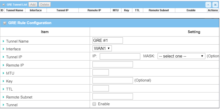 GRE Tunnel Check the Enable box to activate the GRE tunnel