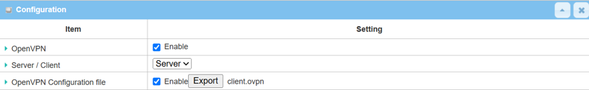 | OpenVPN Configuration File | Click the Export button to download the client.opvn file |