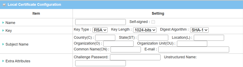 Fill in the certificate information in the columns Country (C) State (ST) Location (L) Organization (O) Organization Unit (OU) Common Name (CN) |