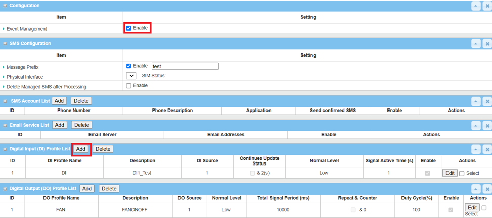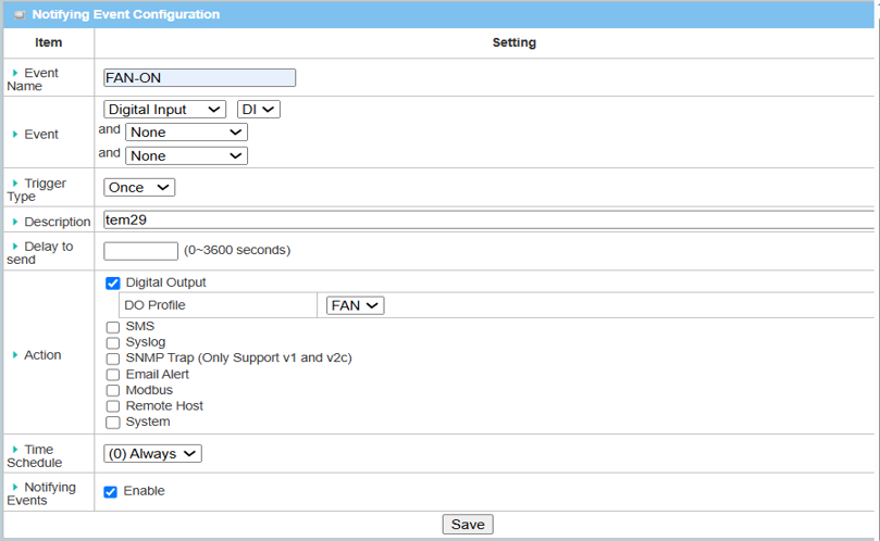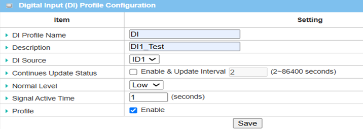 | Event | Select Digital Input as the event trigger and configure a DI profile first |