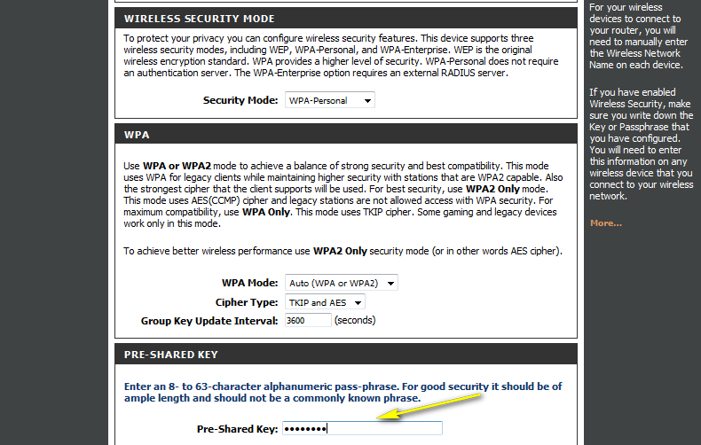 Etapa 4: Desplácese por la página hacia abajo hasta “Wireless Security Mode” (Modo de seguridad inalámbrica) .Esta es la sección en la que se especifica la contraseña inalámbrica. Puede especificar una nueva contraseña; asegúrese de hacer clic en Guardar configuración en la parte superior de la página, una vez completa.