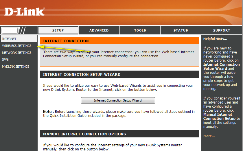 Paso 2: Haga clic en la pestaña “Setup” en la parte superior de la página de configuración y luego haga clic en el botón “Wireless Settings” (Configuración inalámbrica) en el lado izquierdo.