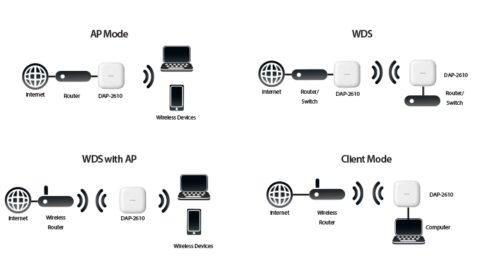 Configure your DAP-2610 access point to meet your specific wireless network requirements with any one of its multiple operation modes: Access Point, Wireless Distribution System (WDS), a WDS with Access Point, and Wireless Client.