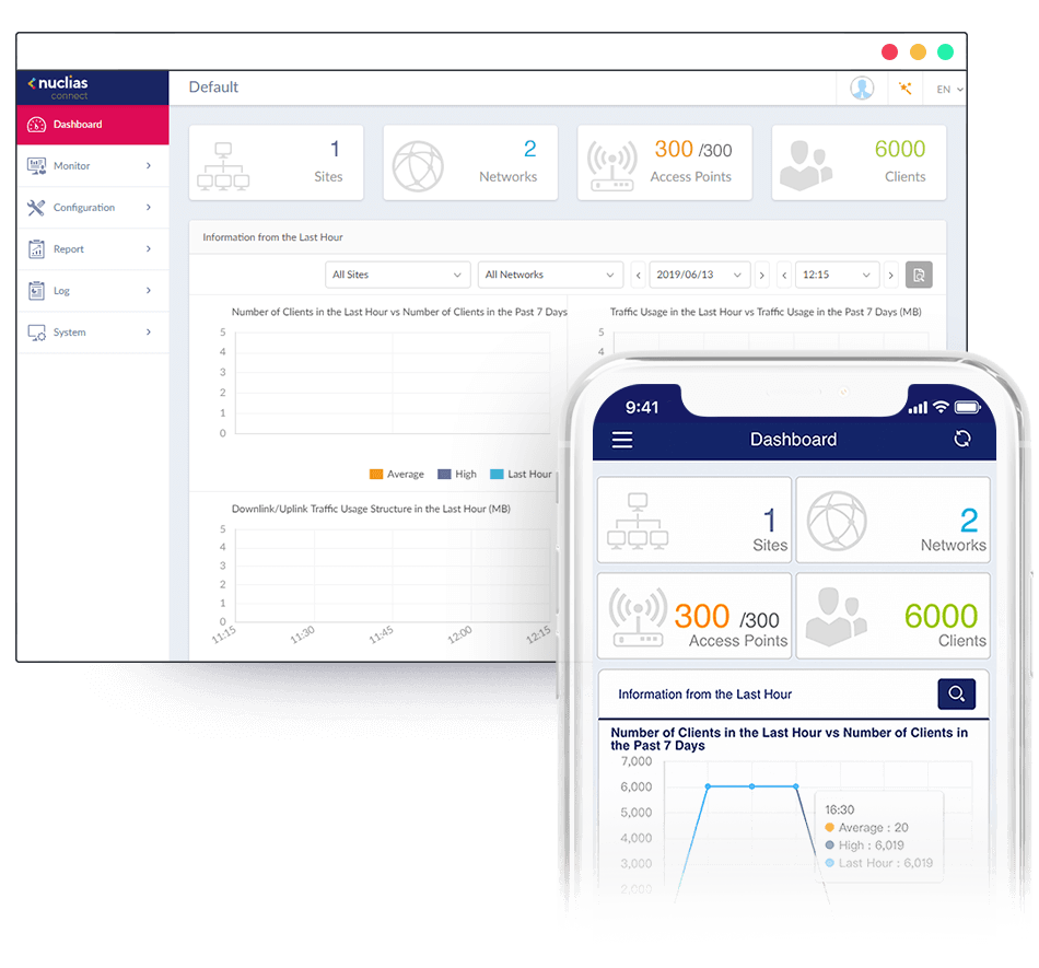 Nuclias Connect enables you to manage and control your network from anywhere and provides an extensive understanding of your network and its users through traffic analytics and status reports via a web browser or our free app. Insights derived from this traffic data can be used to create business value, and traffic can be viewed across the entire network and all the way down to the level of a single Access Point.