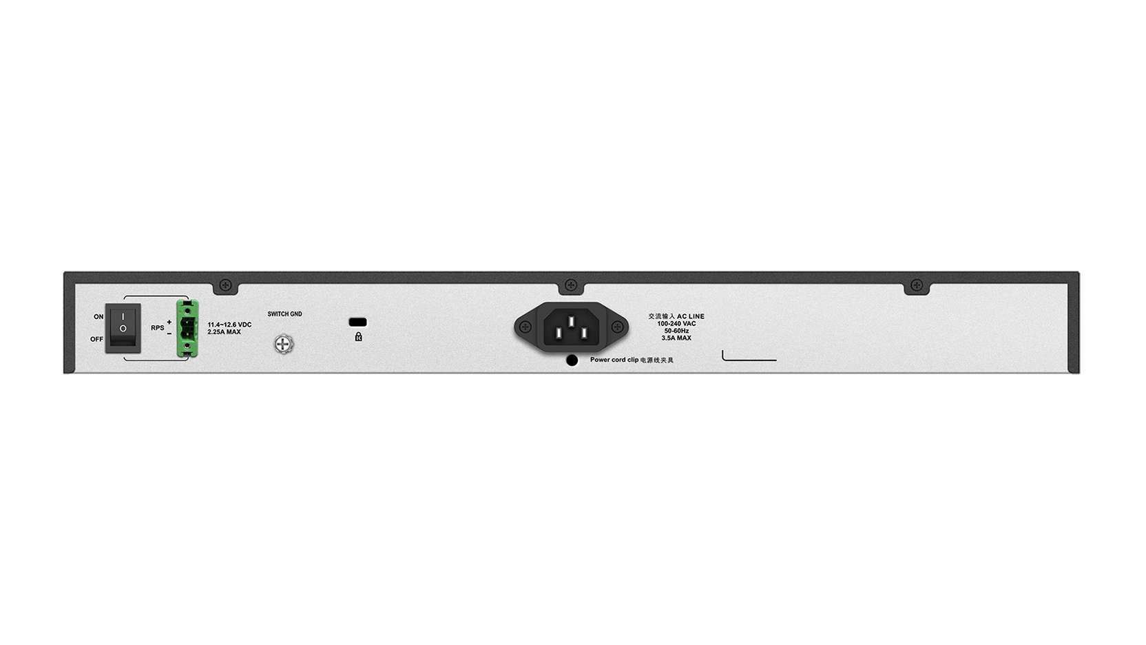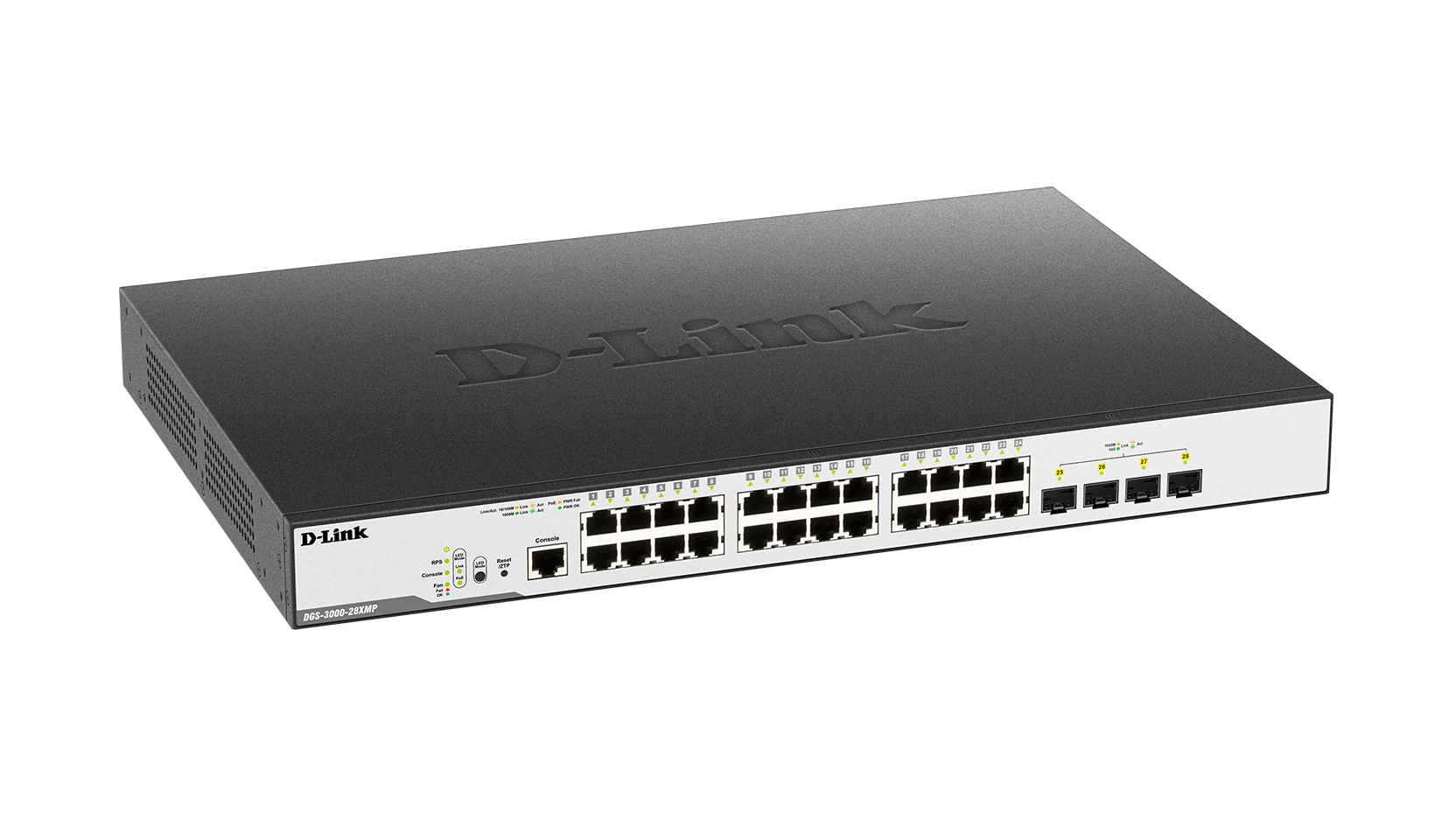 The DGS-3000-28LP switch features Power over Ethernet (PoE), and switching capacities of 56 Gbps.