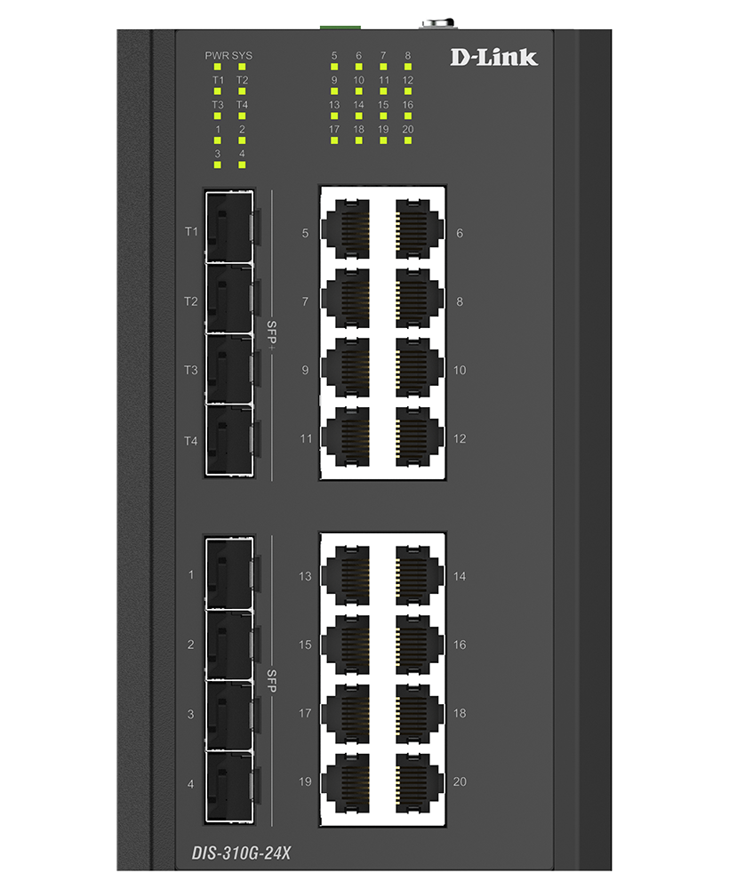 The DIS-310G-24X is an industrial managed switch featuring sixteen 1GE ports, four 1G SFP ports, and four 10G SFP+ uplinks for high-performance aggregation and network backbone connectivity. The SFP interfaces support long-distance transmission, rapid failover, and high-capacity traffic aggregation, while built-in Layer 3 management with static and dynamic routing enables efficient traffic control and scalable network design.