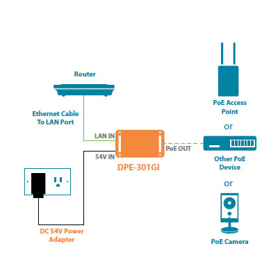 Examples where the DPE-301GI is ideal include powering network devices such as professional network cameras with pan/tilt/zoom, night vision or internal heating/cooling features, as well as the latest wireless access points that support the high throughput 802.11ac standard.