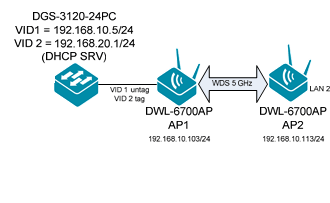 How can I make a WDS bridge between two DWL-6700AP (on the 5GHz frequency band) and to channel 2 VLANs (for customers connected over the 2.4GHz frequency band)?