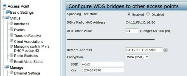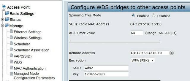 Step 3 - Then configure the WDS bridge, crossing the MAC addresses of the AP and selecting the same SSID and key on the 2 APs