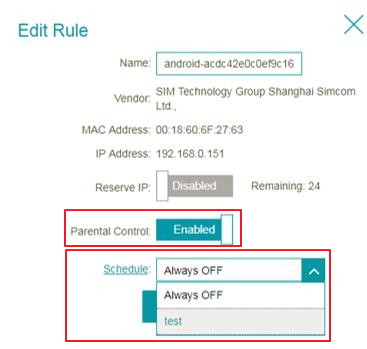 Step 2: Click the pencil icon, then enable parental control & select the schedule to set the time frame of blocking the network access: